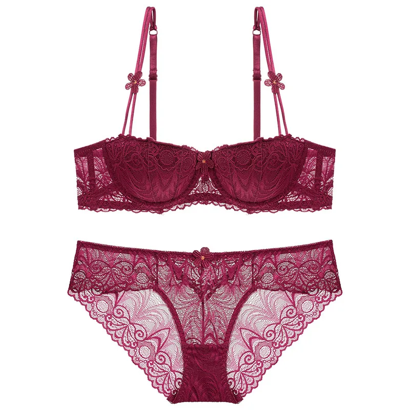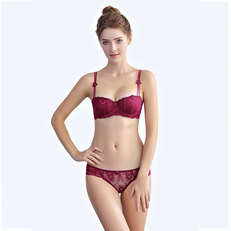 AMX Sexy Bra Set Fashion Flower Lace Push Up Brassiere and Brief Soft Deep-V Thick Cup Sexy Black White Blue WIne Red Lingerie