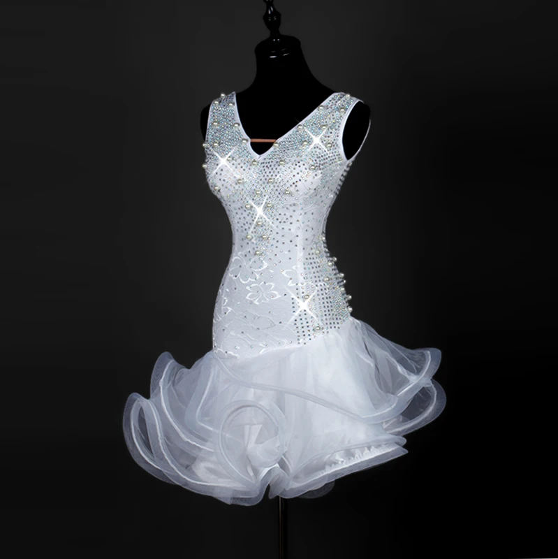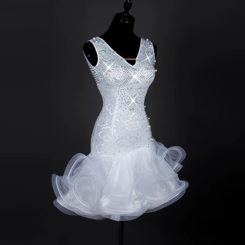 Related Product for Luxury Latin Dance Dress Women Tango Salsa Dress White Color D0175 with Rhinestones Pearls Fluffy S