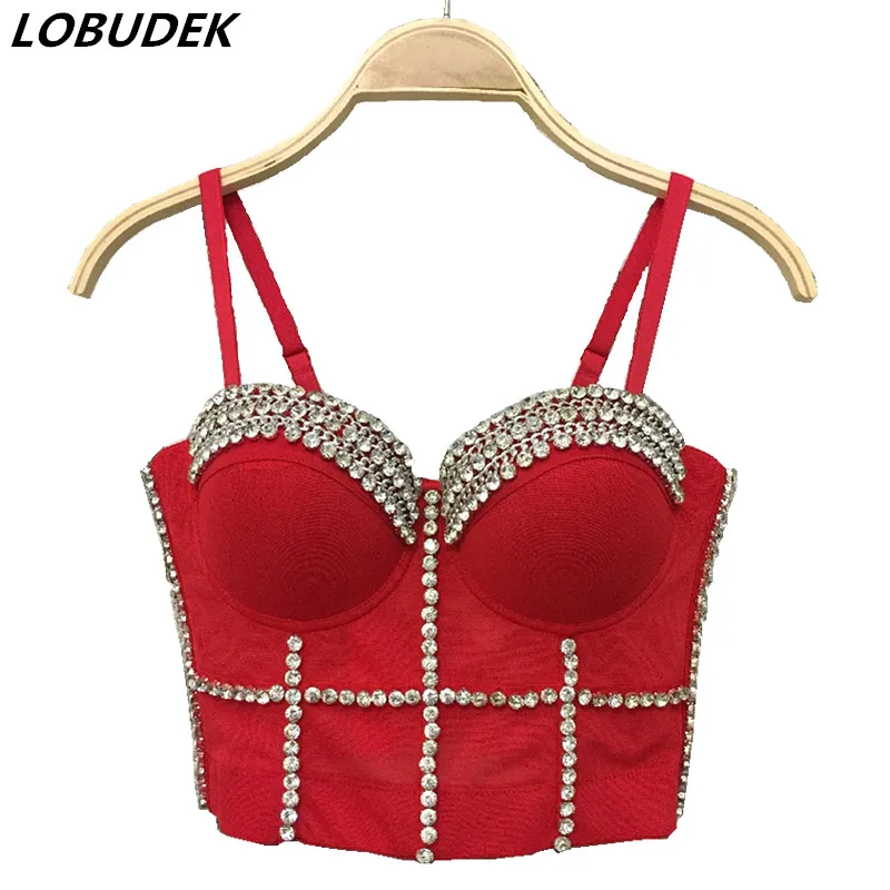 Related Product for Women Black White Red Rivet Bra Sparkly Rhinestones Bra Underwear Bar DJ Singer Undergarment Stage