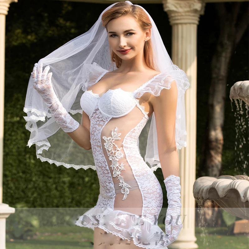 2019 Sexy Lingerie Hot White Bride Wedding Dress Uniforms Perspective Lace Gauze Outfit Erotic Babydoll Costumes