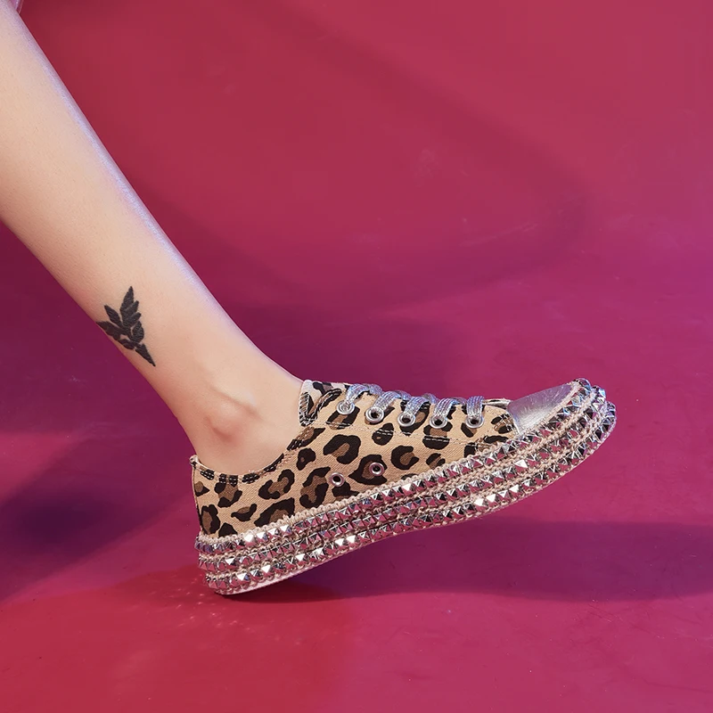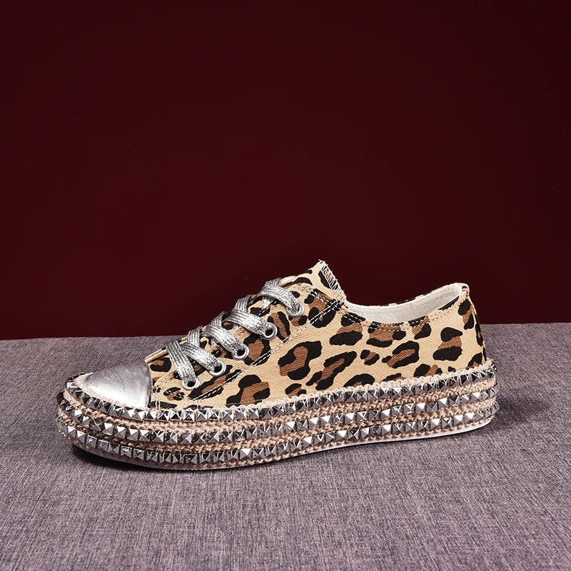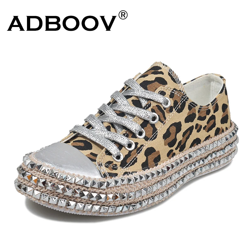 Limited Chance of ADBOOV Rivet Women Canvas Shoes Punk Style Fashion Sneakers Women Leopard Espadrilles Vulcanized Sh